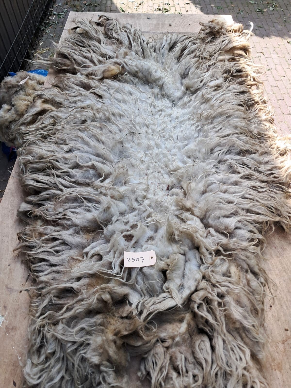Een ruwe vacht van één van onze Veluws Heideschapen, om zelf te verwerken (bijv. spinnen of vilten).